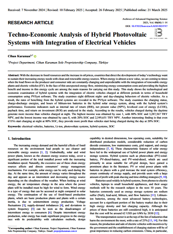 Fosil kaynakların azalması ve petrol fiyatlarının artmasıyla birlikte günümüz teknolojisinin gelişimine yön veren ülkeler artan enerji ihtiyaçlarını temiz ve yenilenebilir enerji kaynaklarıyla karşılamak istemektedir. Enerji neredeyse yeni bir değer haline geldiğinde yenilenebilir enerji santralleri ve elektrikli araçların (EV) entegrasyonuyla üretici ve tüketici tarafındaki yük akışlarının sürekli değiştiği ve öngörülemez hale geldiği zamanlara geliyoruz. Bu beklenmedik enerji akışı karşısında enerji tüketim maliyetlerini en aza indirmek ve bu enerji döngüsünde en yüksek faydayı ve geliri sağlamak bu çalışmanın yapılmasının temel nedenleri arasındadır. Bu çalışma, PVSyst yazılımı kullanılarak hanehalkı tüketimi açısından farklı dönemlerde şarj edilen elektrikli araçların entegrasyonu ile hibrit sistemlerin teknolojik ve ekonomik incelemesini göstermektedir. Çalışmada elektrikli araçların sekiz farklı gece ve gündüz şarj davranışları incelenmektedir. Sonuç olarak PVSyst yazılımında hibrit sistemlerden yararlanma oranları ortaya konmaktadır. Çalışmada hibrit güneş enerjisi sisteminde lityum iyon bataryaların şarj durumu, şarj-deşarj enerjileri ve saatleri ile hibrit sistemin performansı incelenmektedir. Çalışmada iç getiri oranı (IRR), net bugünkü değer (NPV), seviyelendirilmiş enerji maliyeti (LCOE), geri ödeme süresi ve yatırım getirisi (ROI) gibi ekonomik göstergeler analiz edilmiştir. Sonuçlara göre, gündüz şarj edilen araçlar gece şarj edilen araçlardan daha fazla gelir üretmektedir. En yüksek gelir %80 SOC ve 3.287.567 TRY NPV ile durum 1'de elde edilirken, en düşük gelir %20 SOC ve 2.549.651 TRY NPV ile durum 8'de elde edilmiştir. Bir diğer ilginç bulgu ise, EV'ler gece %80 SOC ile şarj edilmeye başlasalar bile, gündüz %20 SOC ile şarj edilmeye başlanan araçlardan daha fazla kar sağlamalarıdır.