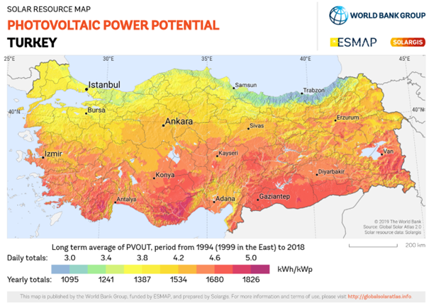 Yukarıda görmüş olduğunuz atlasta, Türkiye'nin güneş enerjisi potansiyelinin, solar inverterler ile üretime dönüştürülmüş halini görmektesiniz. Haritadan da göreceğiniz üzere, Türkiye'nin güney kısımları kuzey taraflara göre daha fazla güneş radyasyonuna sahiptir. Bu da güney bölgelerin üretimlerinin kuzey bölgelere göre daha fazla olacağını göstermektedir. En aşağıdaki bar grafikte ise, spesifik üretim diye tabir ettiğimiz, fotovoltaik panellerle kurulu bir santralin kWp gücünde kaç kWh enerji üreteceğini göstermektedir. Örneğin, Gaziantep'te 200 kWp gücünde kurulu bir santral, Gaziantep bölgesinin spesifik üretiminin yaklaşık 1680 kWh baz alındığı öngörüldüğünde, santralin yıllık üretimi yaklaşık olarak 336.000 kWh olacaktır. Aynı santral Bursa ilinde kurulduğu varsayılır ise, spesifik üretimi yaklaşık olarak 1387 kWh olarak alındığında, yıllık santralin üreteceği enerji miktarı ise 277.400 kWh olacaktır.